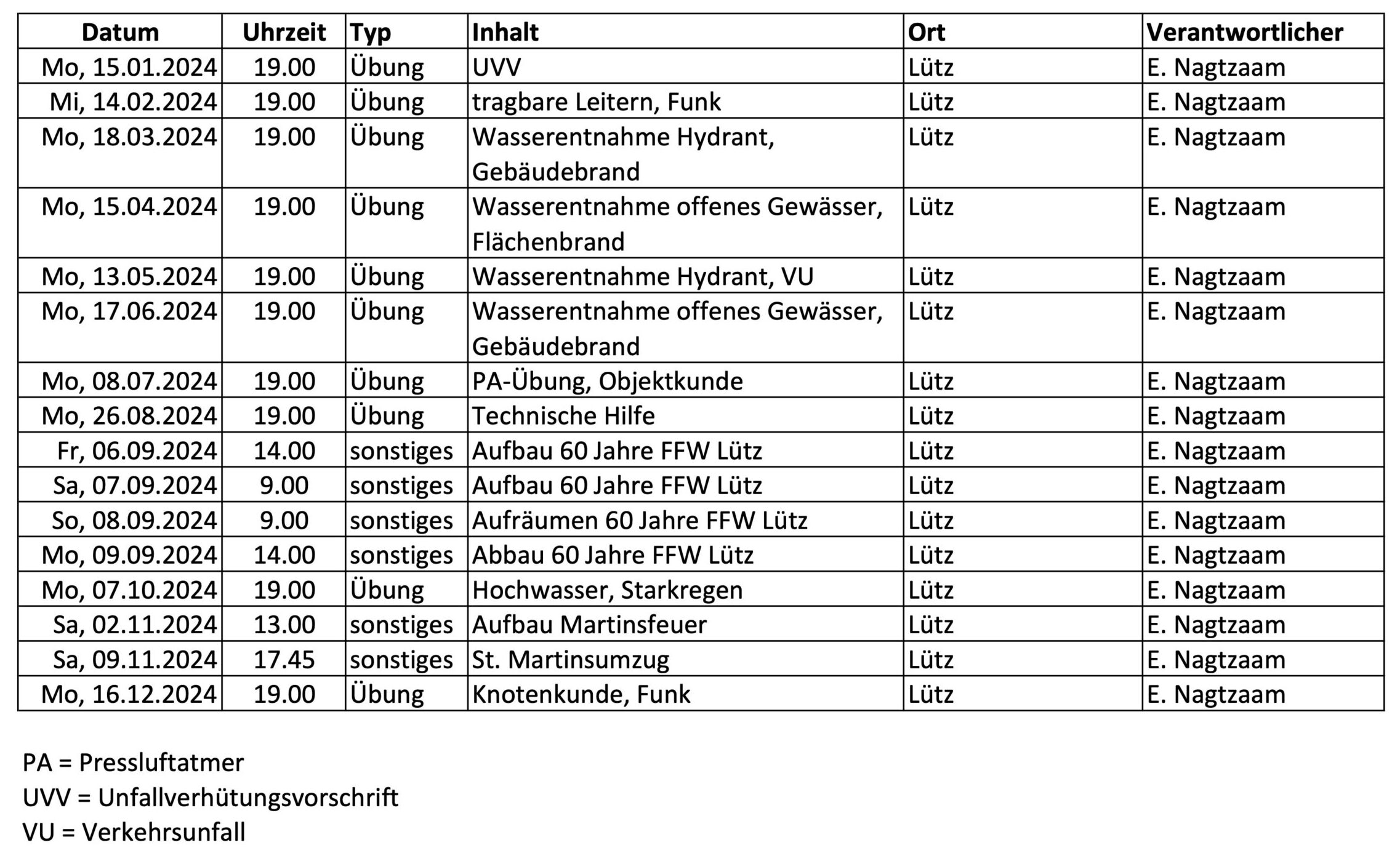 Übungsplan 2024 der Freiwilligen Feuerwehr Lütz Category: Freiwillige Feuerwehr LützVon Feuerwehr1. Dezember 2023 Autor: Feuerwehr KommentarnavigationZurückVorheriger Beitrag:Büchertisch 2021NächstesNächster Beitrag:Wehrführerwahlen 30.08.2024Related Posts10. Lützer Adventszauber27. November 2025🚒🔥 Neue Fahne für die Freiwillige Feuerwehr Lütz 🔥🚒10. Oktober 2025🚒 Einweihung des neuen KLF – Lütz 🚒23. August 2025🚒🔥 Einsegnung des KLF Lütz 🔥🚒23. August 2025🚒 ÜBUNG – Aggregat & Sendemast ⚡️14. Juli 2025🚒 Übungseinsatz mit der FW Lieg & FW Lütz 🔥12. Mai 2025