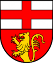 Im geteilten Schild, oben in Silber ein rotes Balkenkreuz, unten in Rot ein schwarzbewehrter und -gezungter wachsender goldener Löwe.